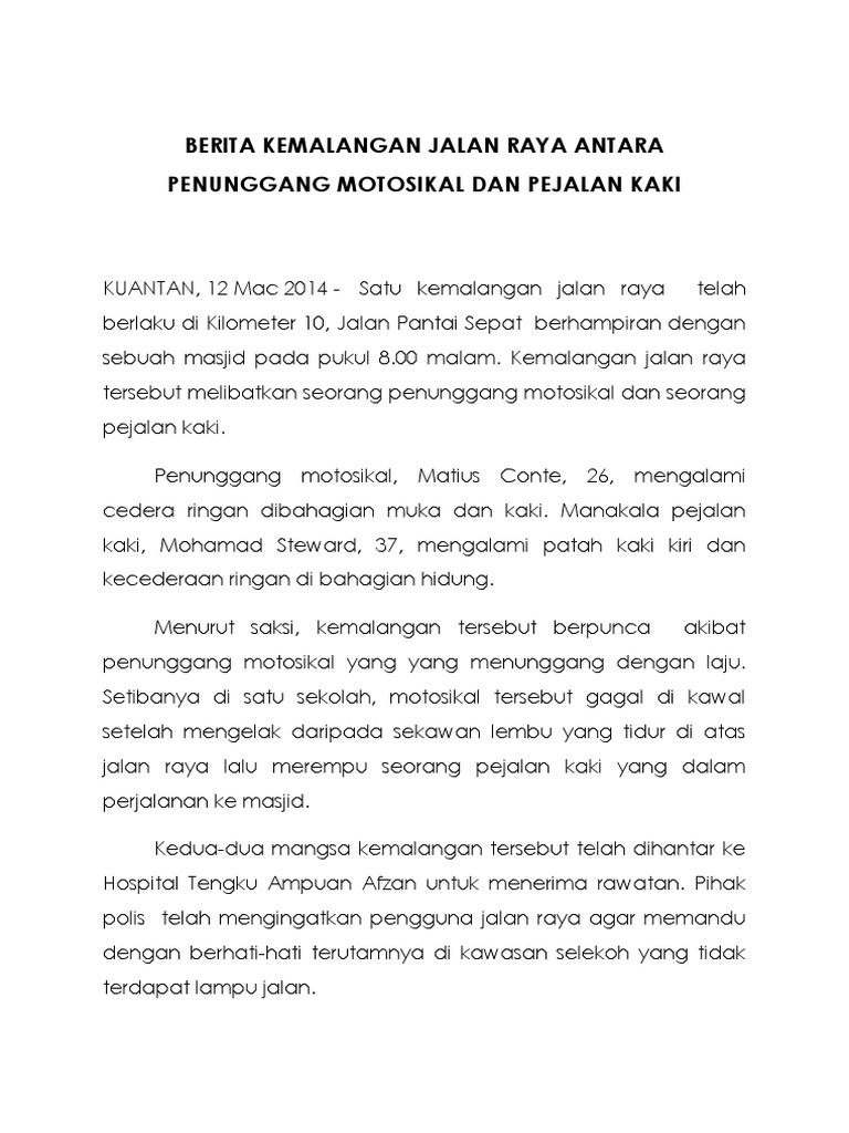 Kemalangan Jalan Raya Dijangka Meningkat Miros from www.sinarharian.com.my Behaviour issues in road safety. Keadaan raja farah kini stabil dan dia melahirkan rasa syukur kerana terselamat dari kemalangan ngeri itu. Kemalangan jalan raya boleh berlaku disebabkan oleh faktor pengguna jalan raya faktor pengguna jalan raya adalah. #kemalangan jalan raya , #afghanistan , #berita terkini , #berita hari ini , #berita dunia , #berita internasional. Berita kemalangan jalan raya by muniesalleh in types > creative writing. 20 berita harian, jumaat 13 febuari. Berikut adalah info berkenaan statistik kemalangan jalan raya.sila klik video untuk berita selanjutnya. Untuk mendapatkan maklumat terkini atau menghantar maklum balas, sila berhubung dengan saluran komunikasi suke di talian hotline 1 300 88 9922 atau laman sosial facebook.